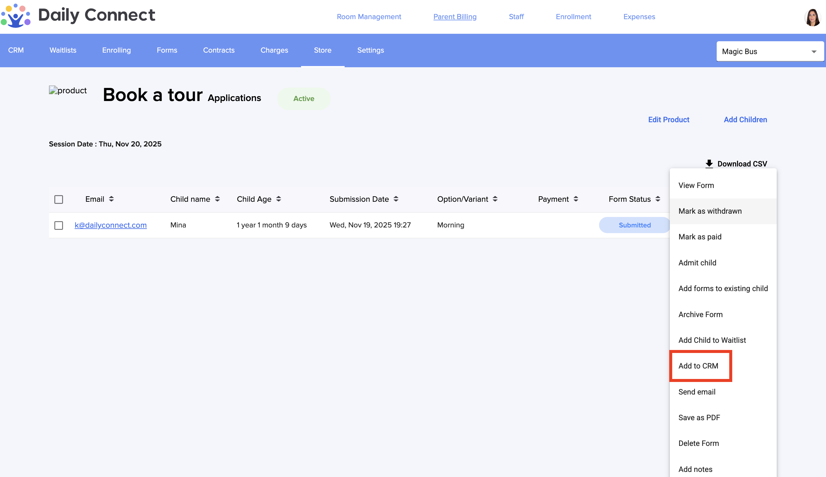 Daily Connect provides a "CRM'-style feature to help you track families interested in your programs.