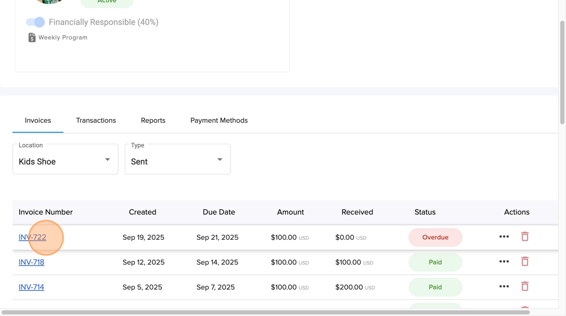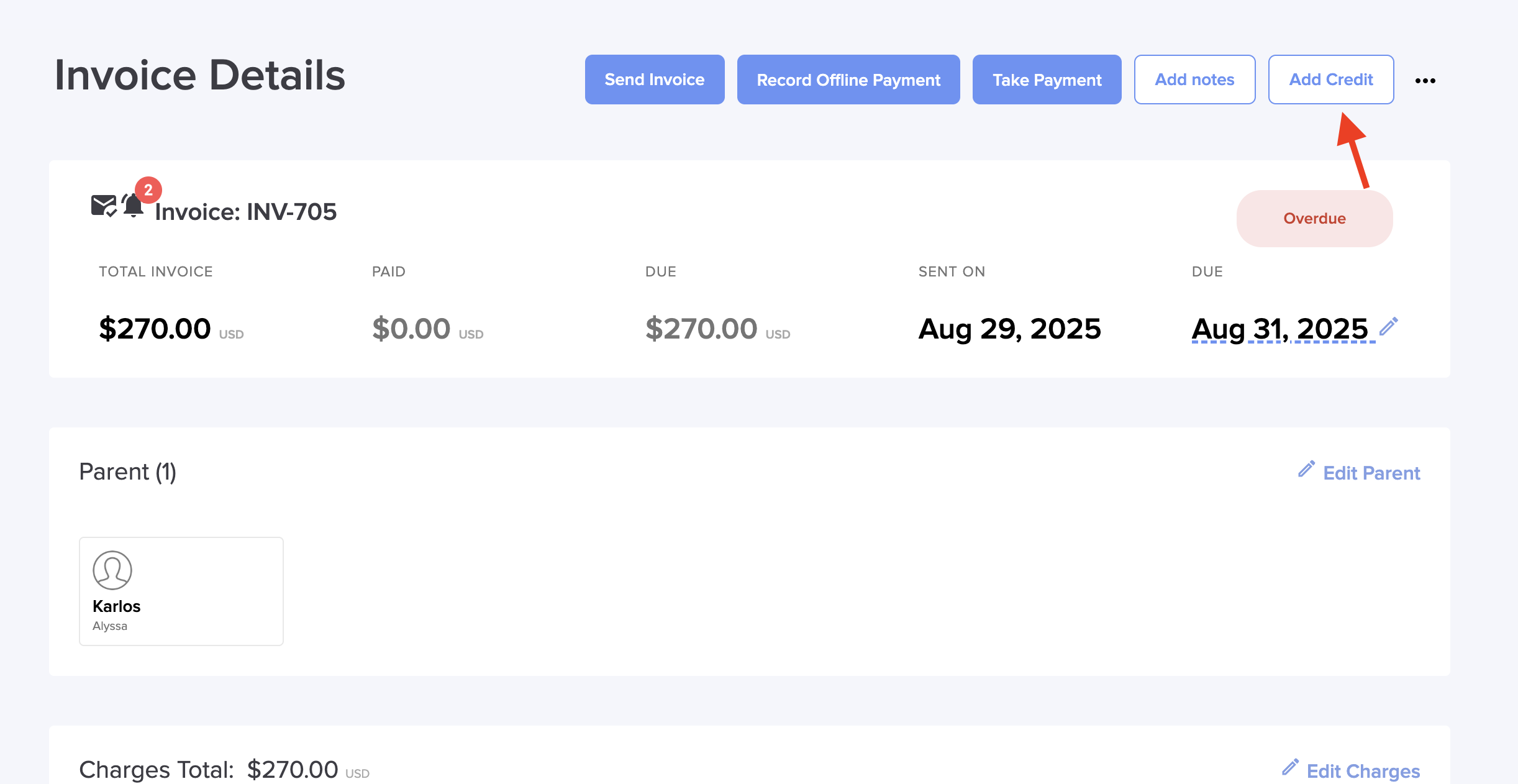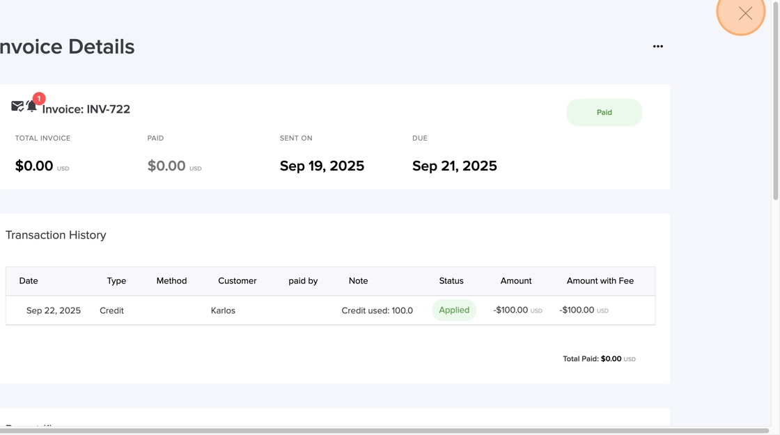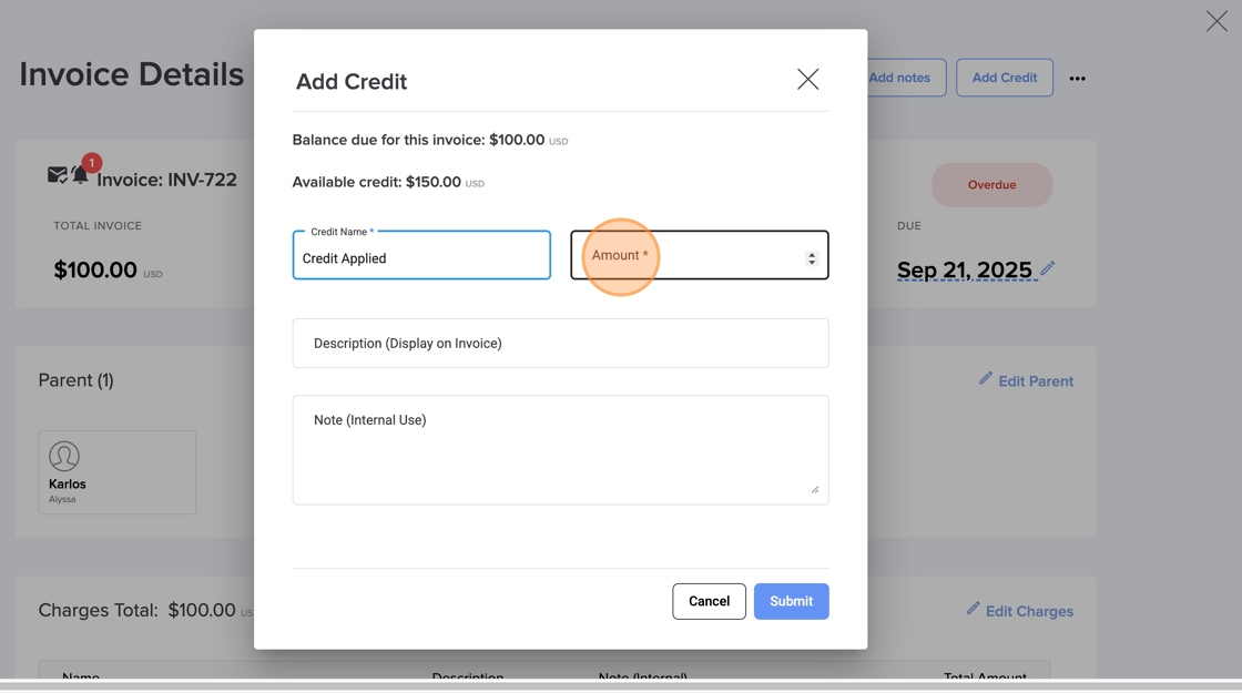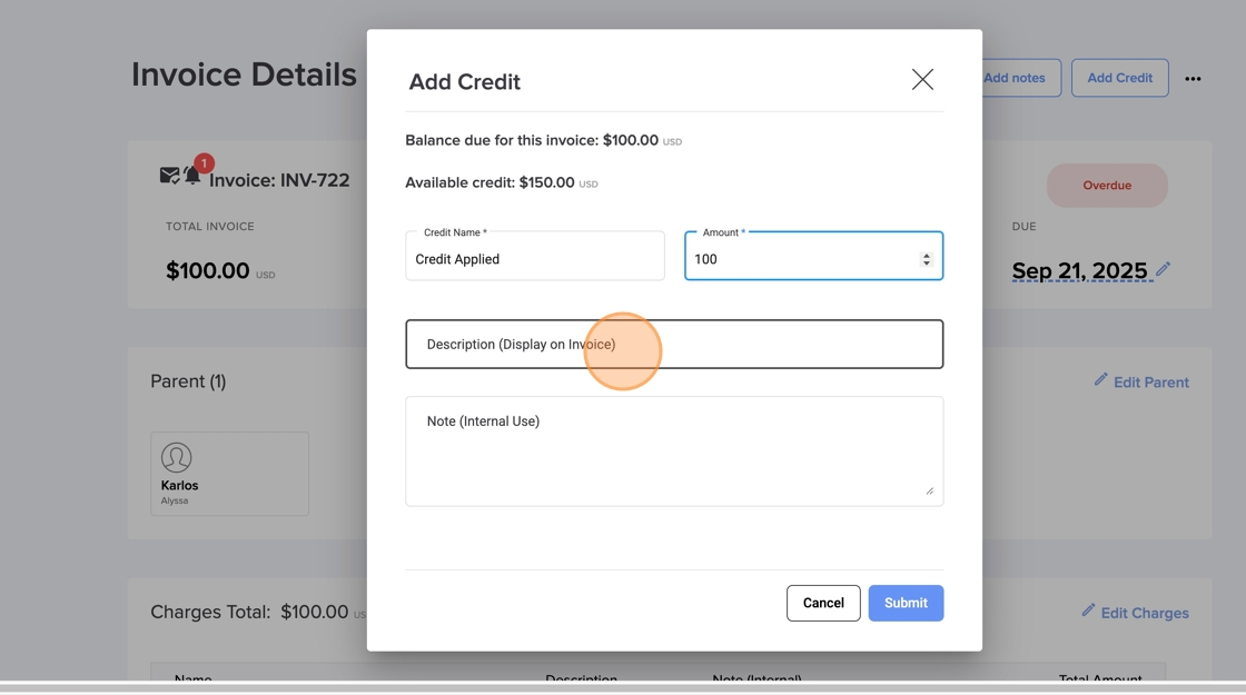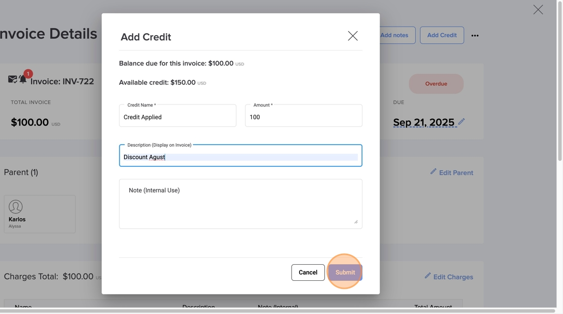 8. Here it will show you the amount of credit available and the balance due for the invoice.