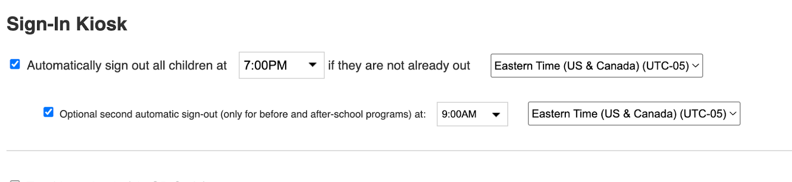 Second optional automatic sign-out: We’ve added a second optional automatic sign-out time. This is especially helpful for programs offering before- or after-care, as it allows you to set an additional automatic sign-out time when needed.