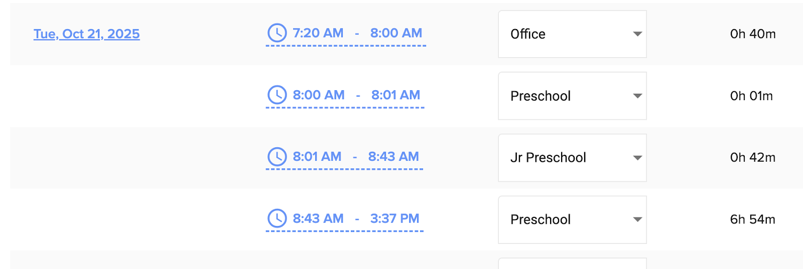 Staff Time Cards: Cards now show classroom change times and classroom names—in addition to first-in and last-out times—for clearer and more accurate records.