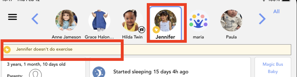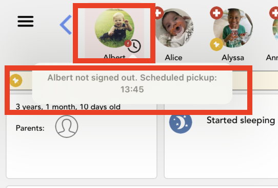 In the application, we can see when a child's checkout has not been recorded after their scheduled end time (which must be set in the Schedule section).