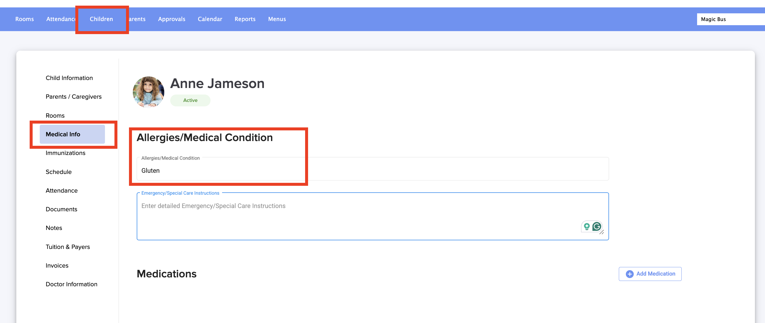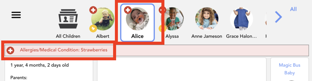 Different symbols may appear on each child's profile photo to help understand the child's situation at any given time.