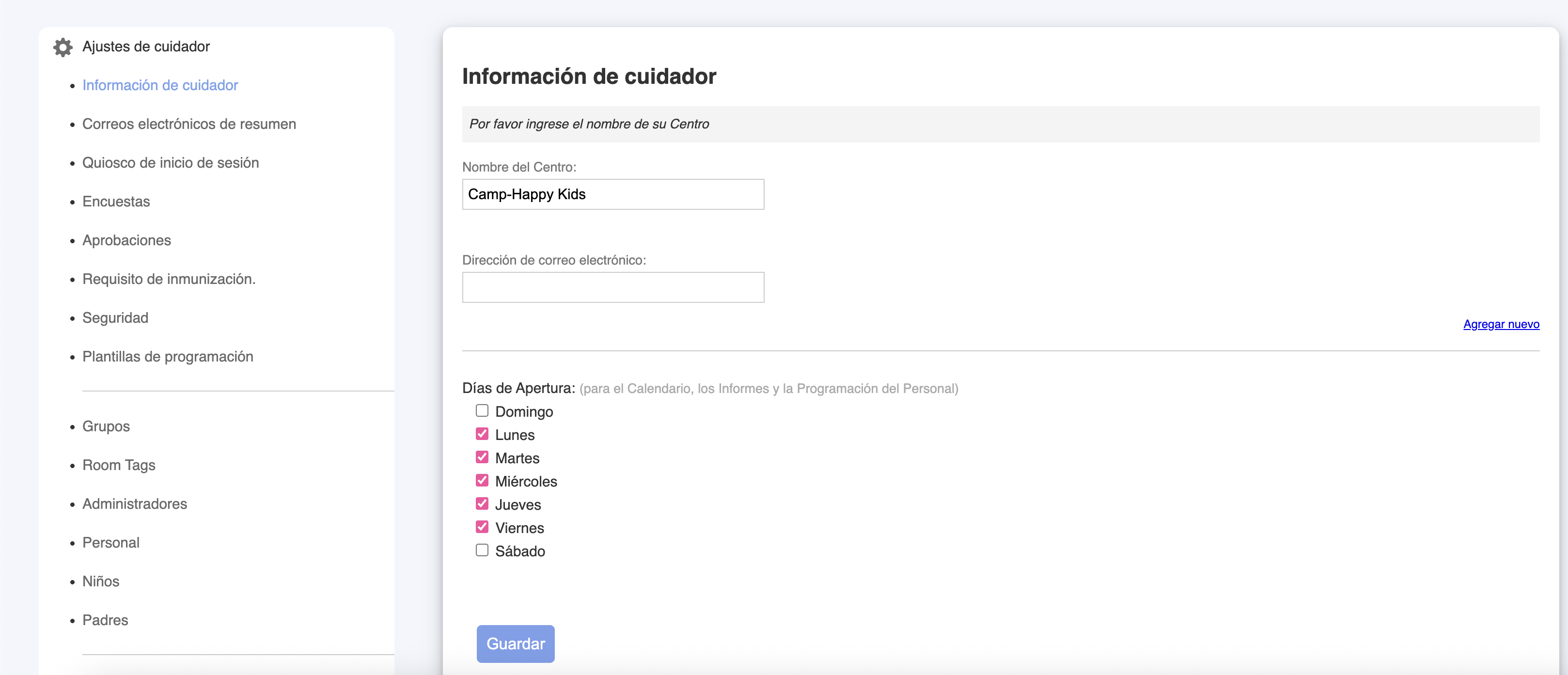 1. Vaya a Configuración del Centro de Cuidado Infantil