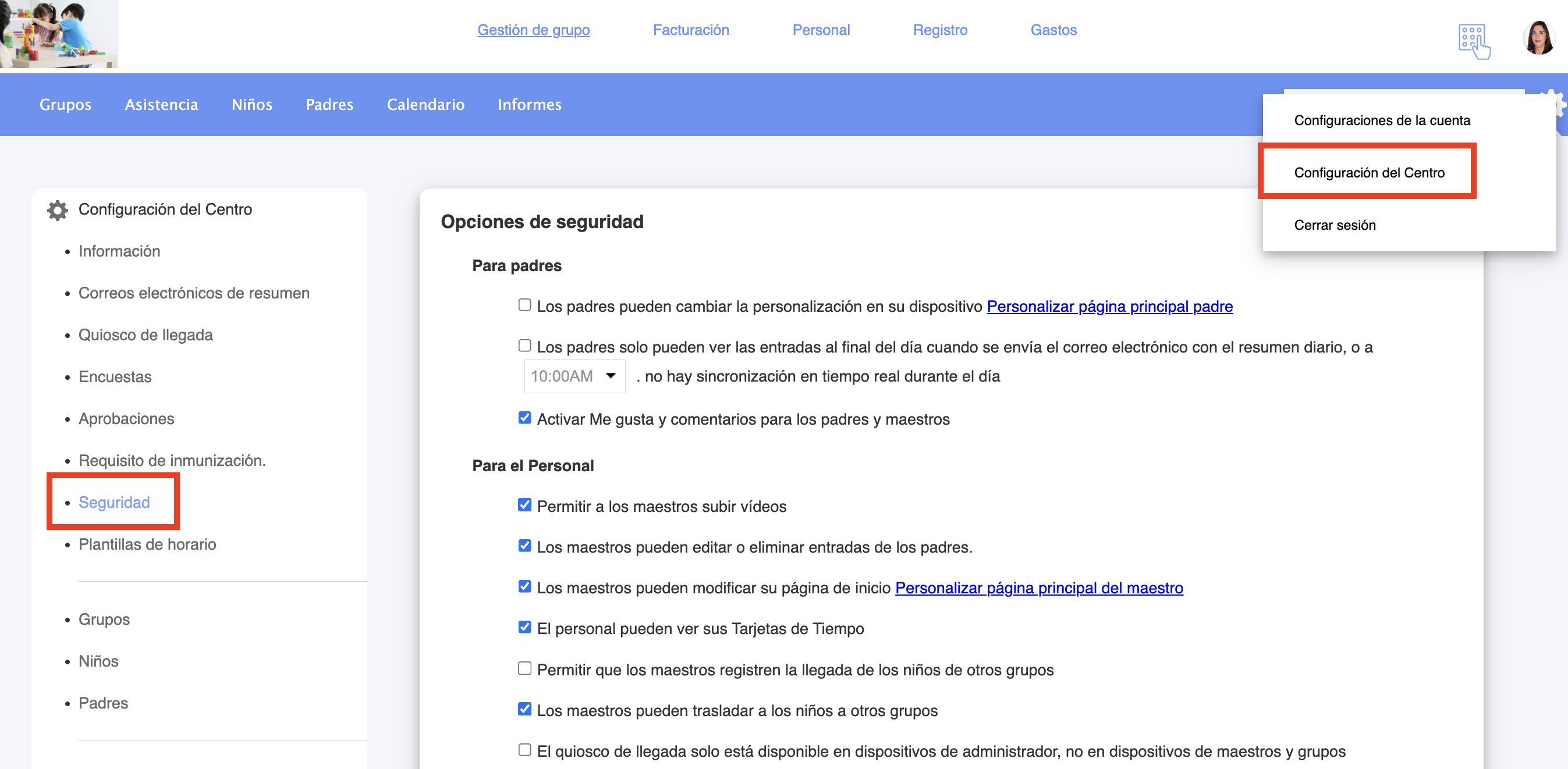 - Haz clic en Configuración del Centro y selecciona la opción Seguridad