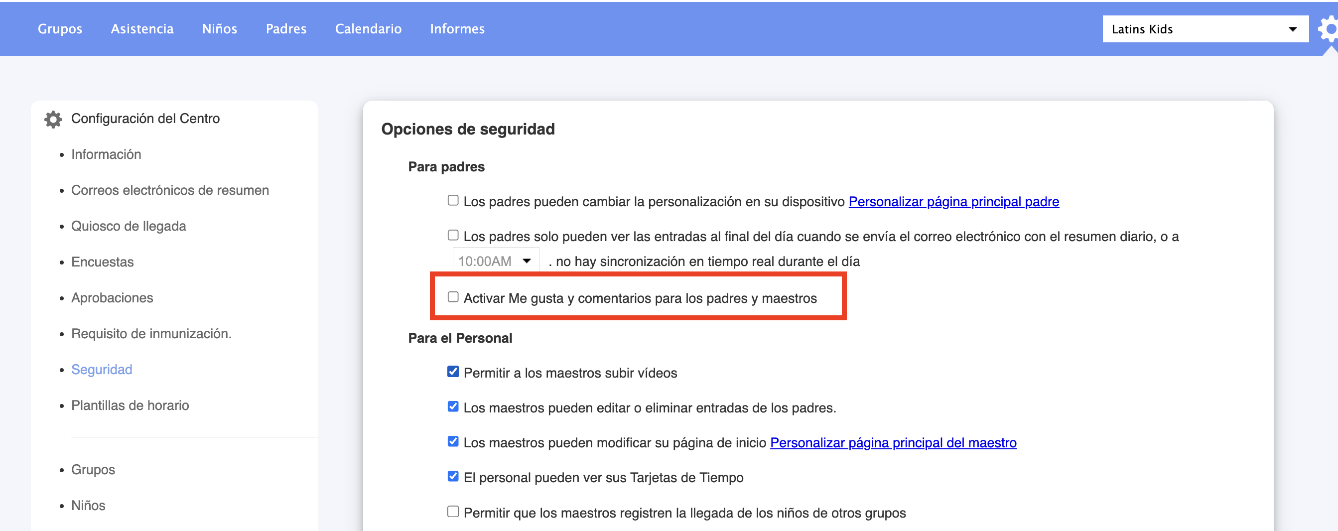Activa la casilla que dice Activar Me Gusta y Comentarios para Padres y Maestros