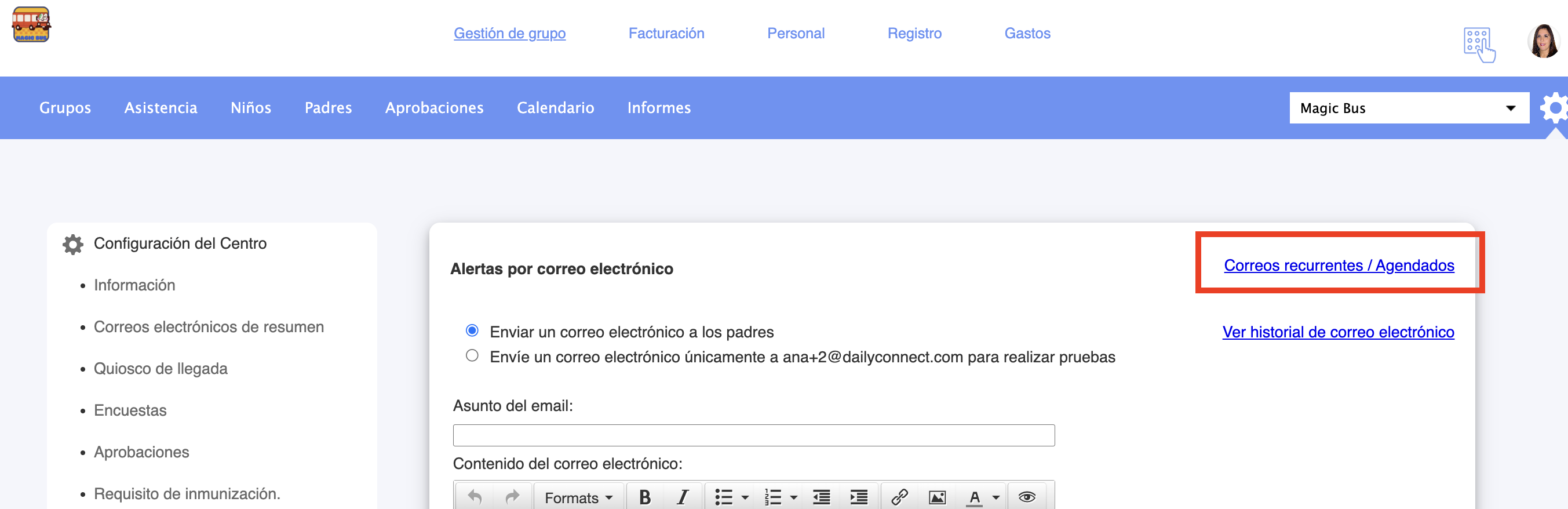 Los correos electrónicos y mensajes de texto masivos enviados por los administradores ahora se envían únicamente a los padres, y no a familiares extendidos, niñeras o personas autorizadas para la recogida, asegurando que la información importante llegue a las personas adecuadas.