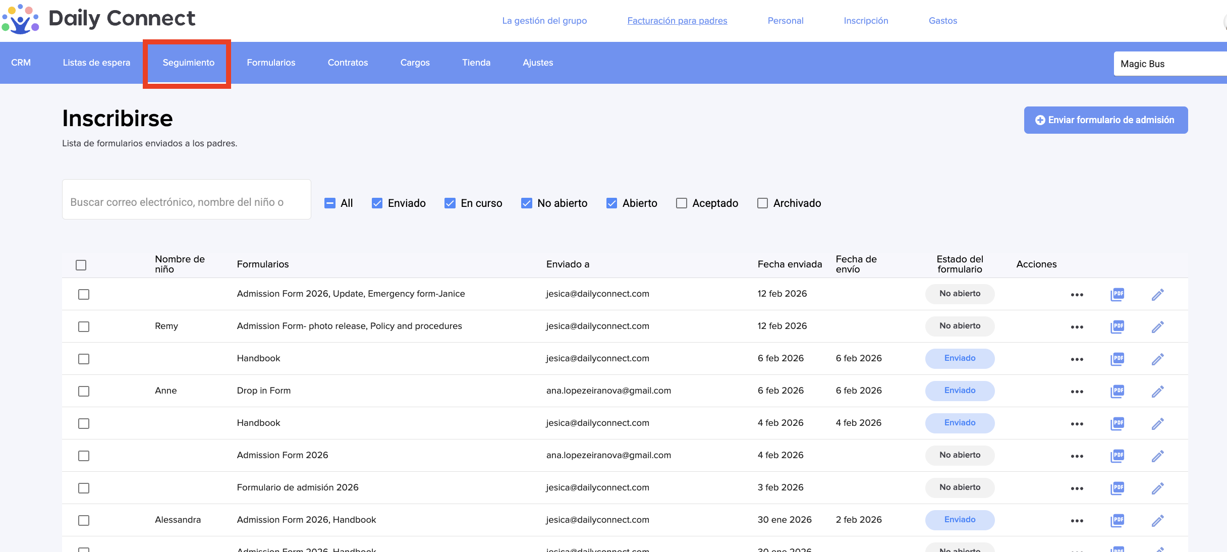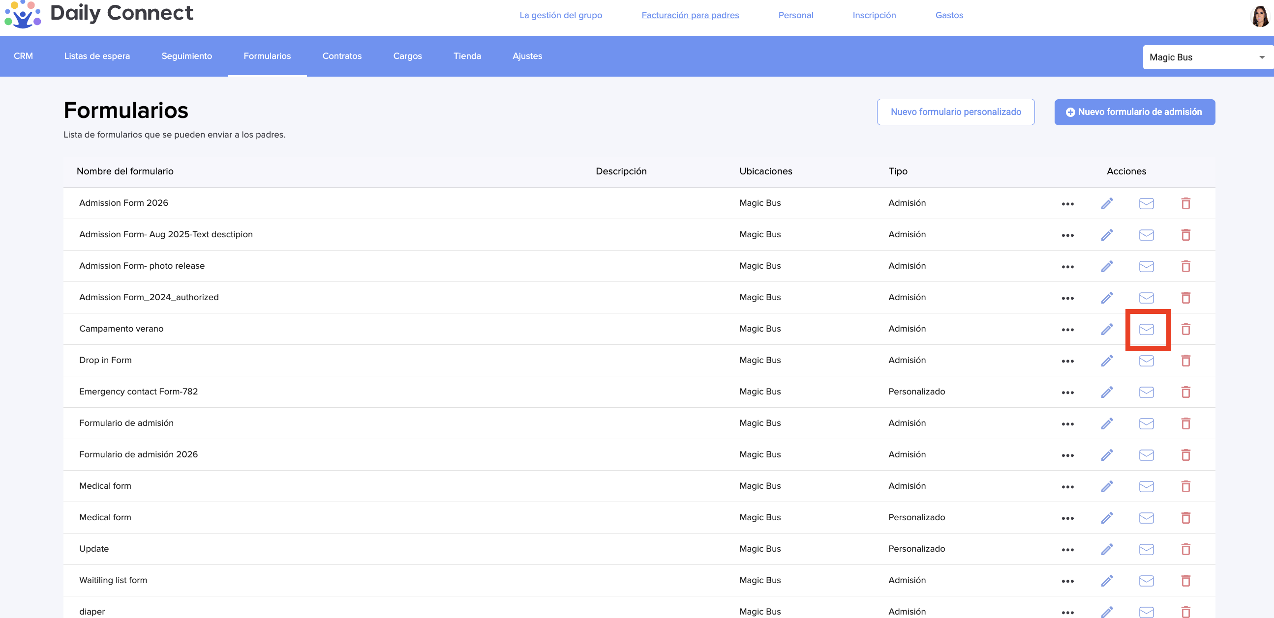 Puede enviar formularios a los padres desde el panel de administración en cualquier momento. Por favor, siga estos pasos: