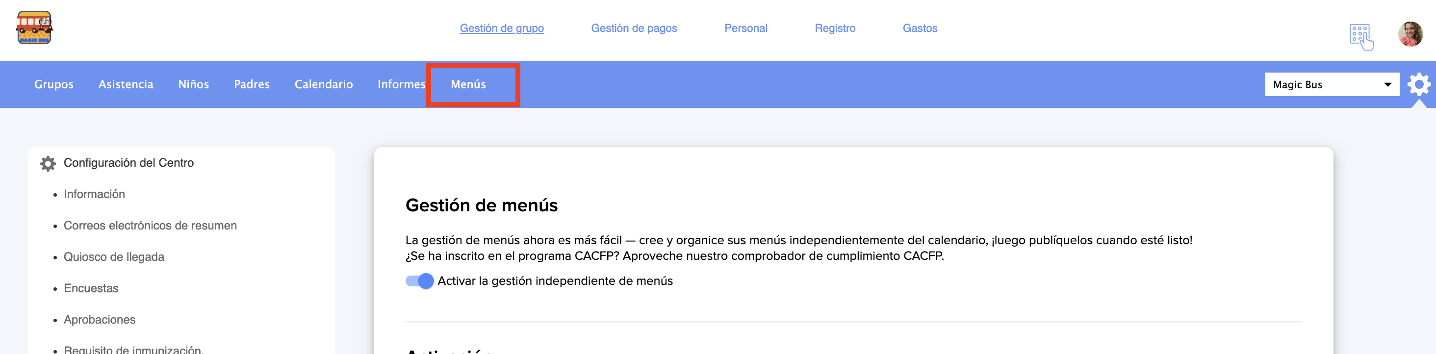Una vez que haya activado el programa CACFP en su cuenta de Daily Connect, puede comenzar a configurar sus menús. Para hacerlo, siga los pasos a continuación.