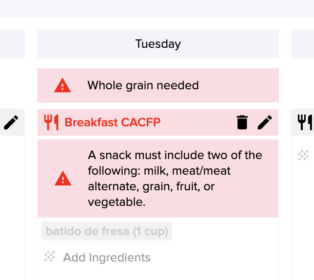 7. Y listo, ya tiene configurado el desayuno. Si agrega un ingrediente o falta alguno que no cumpla con el programa CACFP, nuestro sistema se lo notificará: