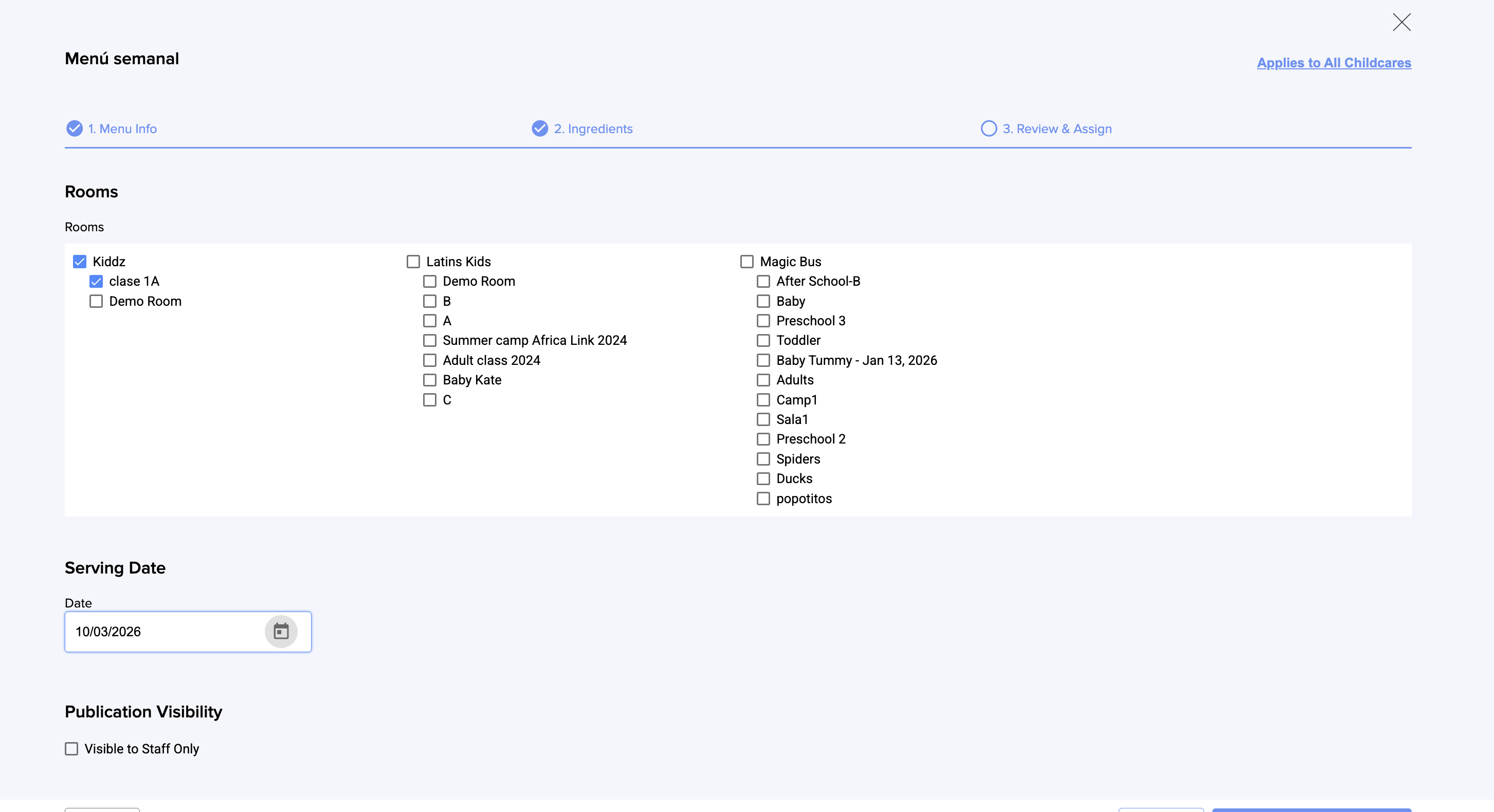9. Seleccione la fecha de publicación del menú y si será visible únicamente para el personal del centro: