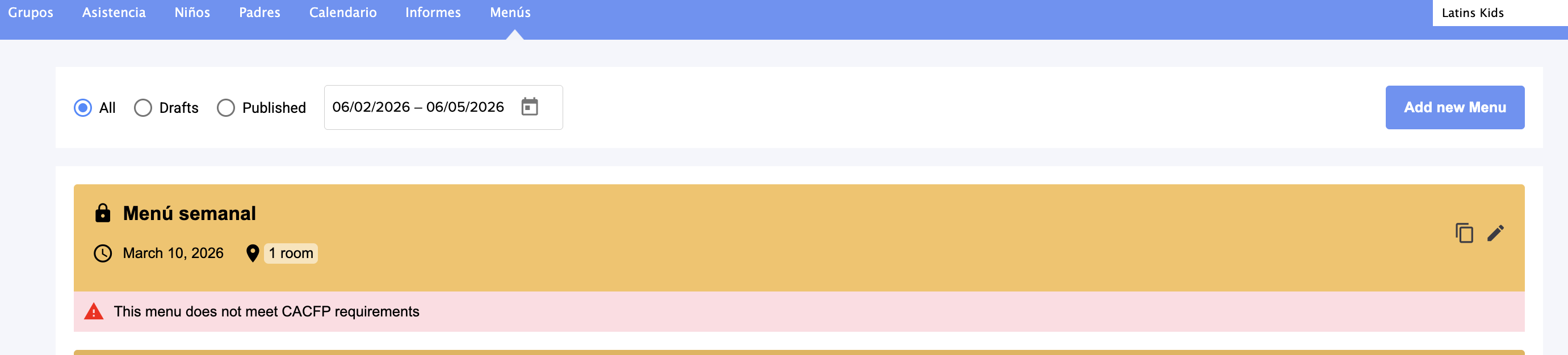 11. Y eso es todo. Si, como en este ejemplo, hay algo que no cumple con los requisitos del CACFP, el sistema continuará notificándole que debe modificarse. Puede hacerlo haciendo clic en el ícono del lápiz: