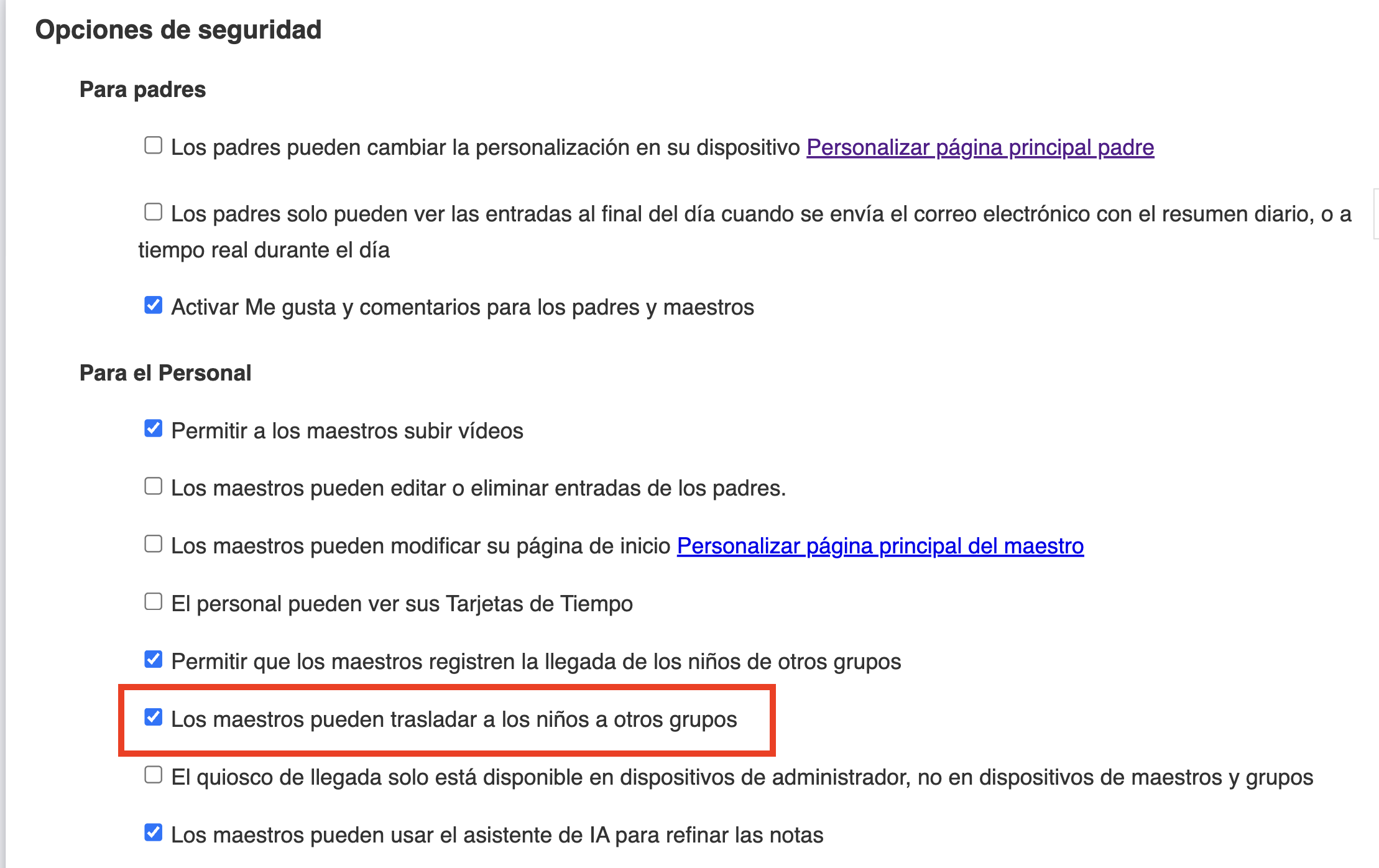 Existe una opción para conceder a los maestros la posibilidad de mover a los niños de una clase a otra.