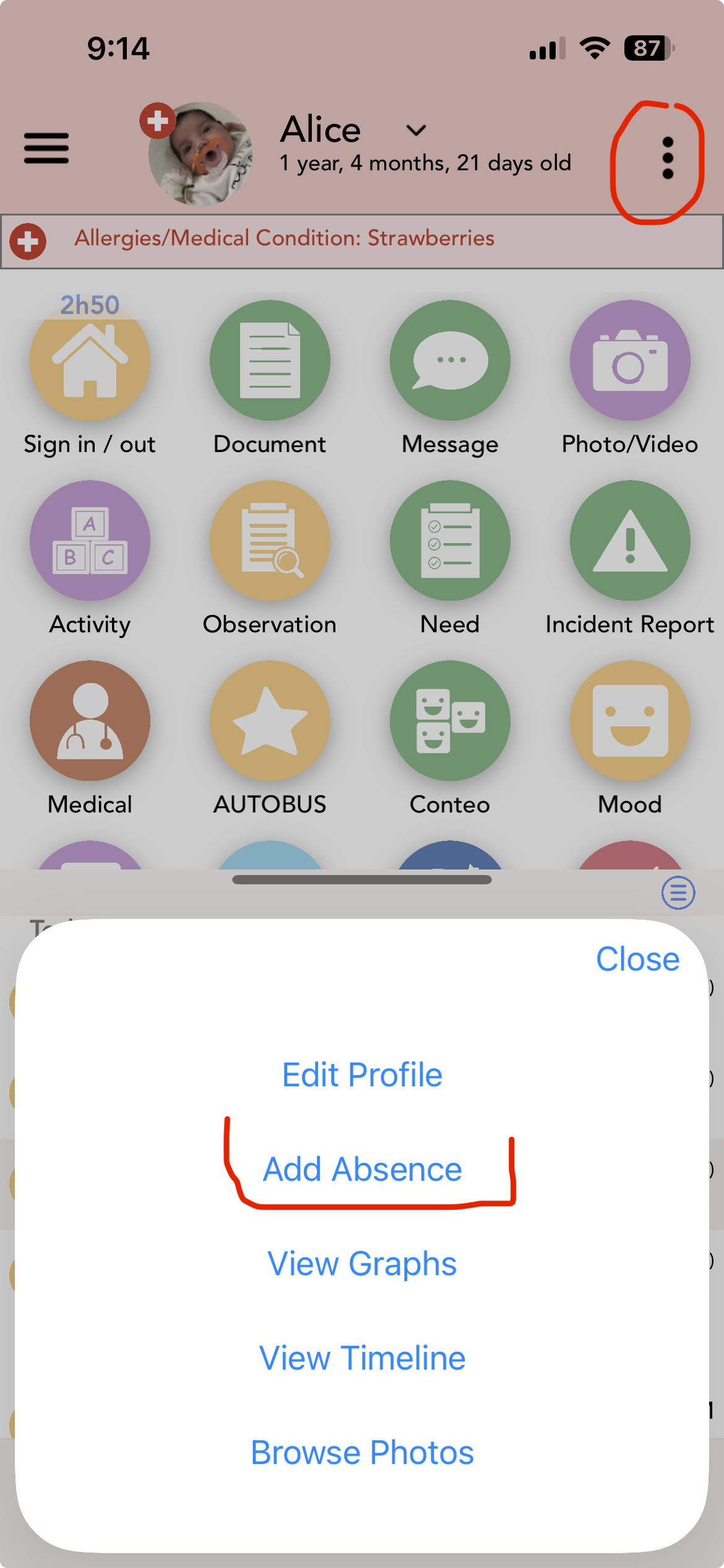 Tap on the 3 dots next to the child's icon and then tap "Add absence"